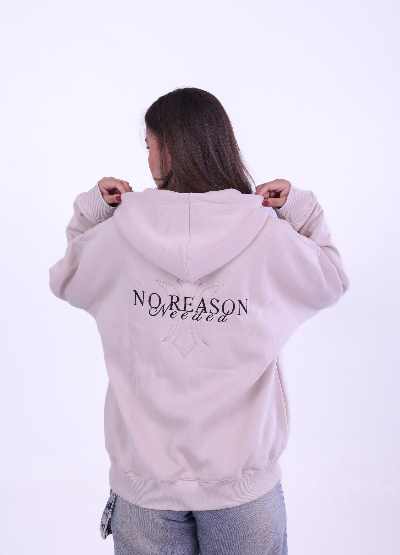 A heavyweight black zip-up built for attitude and everyday wear. Featuring the signature No Reason Needed collar detail on the inner layer and the bold embroidered back graphic. Oversized fit, thick fabric, and clean lines — made for those who move with purpose, even when there’s “no reason.”